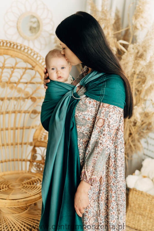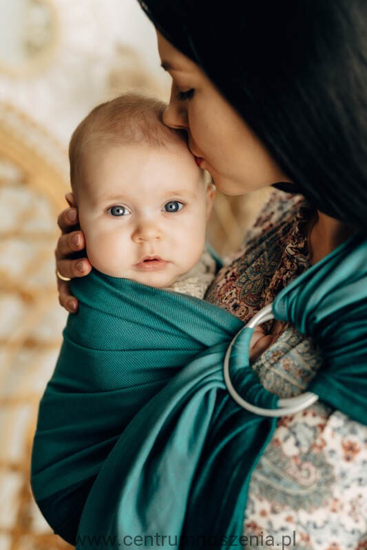 Nie wymaga wiązania! Wystarczy przełożyć chustę przez kółka, włożyć dziecko i dociągnąć. Jest lekka i zajmuje niewiele miejsca