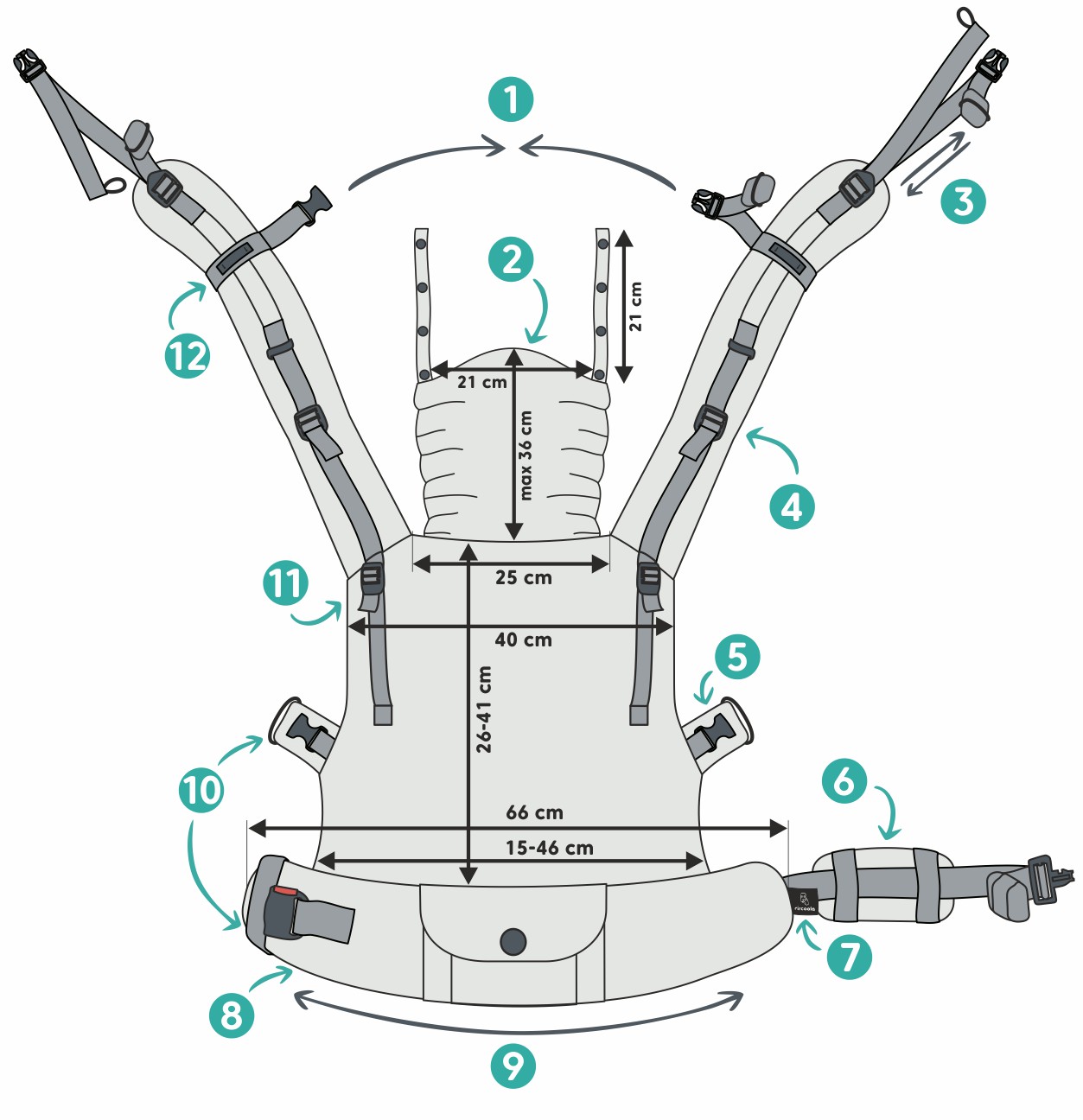 1. Klasyczna klamra 2. Odpinany kapturek 3. Dwukierunkowa regulacja pasów 4. Regulacja długości pasa ramiennego 5. Poduszki pod klamrami 6. Poduszka na pas biodrowy 7. Identyfikacyjny tag NFC circoola® 8. Lekki i stabilny pas biodrowy 9. Regulacja szerokości panelu: układająca się w zakladkę 10. Gumki zabezpieczające 11. Regulacja wysokości panelu: na klamrę, płynna 12. Zdejmowany pas piersiowy |